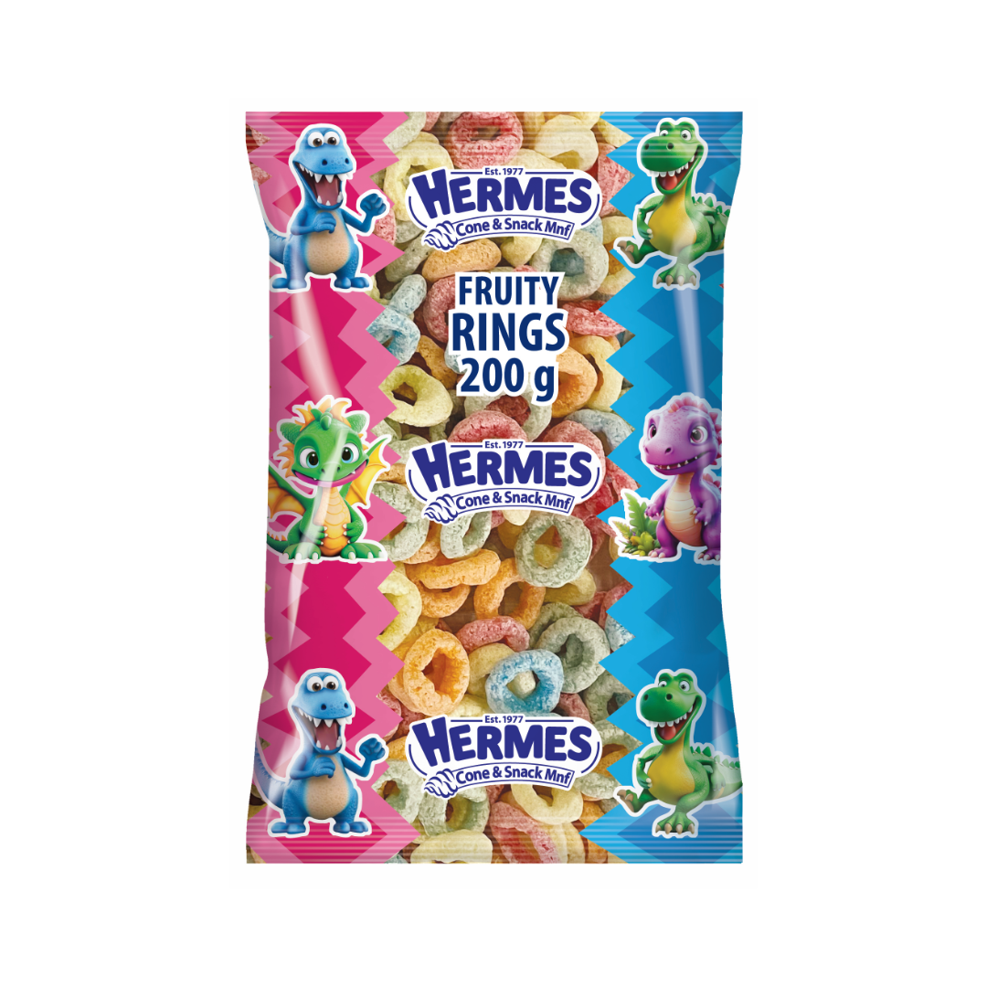 Hermes Fruity Rings are sugar coated maize based rings with an intense sweet and fruity flavour.